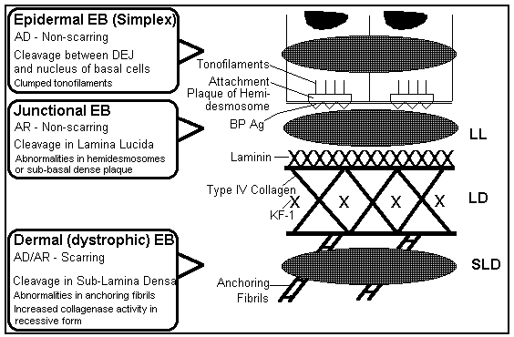 Figure 1: Diagram of the ultrastructure of the dermo-epidermal junction showing the sites of cleavage (blister formation) in the three main types of epidermolysis bullosa, a genetically-determined bullous disorder. |