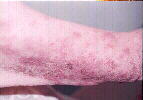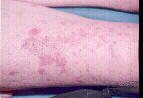 A further relapse followed at the beginning of May. Targetoid and annular erythematous purpuric lesions were seen on the upper chest, arms, forearms, hands, thighs and legs. | |